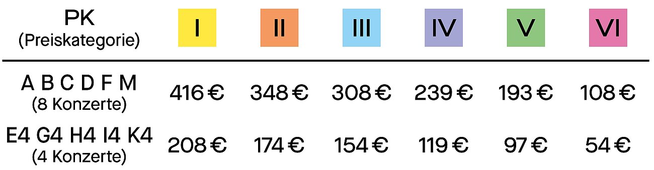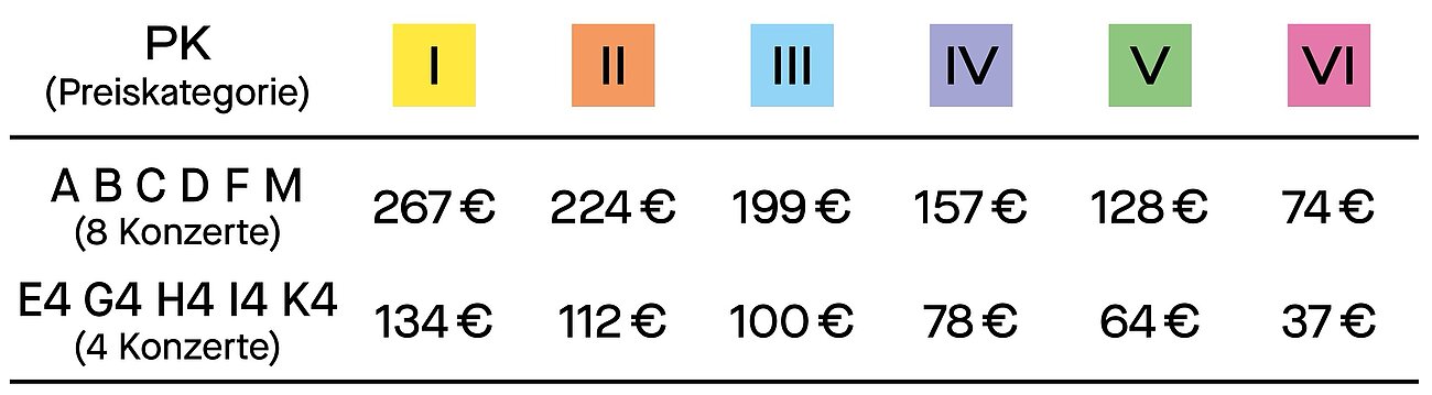 Der Saalplan der Isarphilharmonie ist bei den Münchner Philharmonikern in sechs verschiedene Preiskategorien eingeteilt. Abos lassen sich ebenfalls in den sechs verschiedenen Preiskategorien buchen. Es gibt Abonnement-Reihen mit acht Konzertterminen (A, B, C, D, F & M) und Reihen mit vier Konzertterminen (E4, G4, H4, I4 & K4).